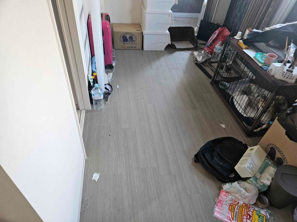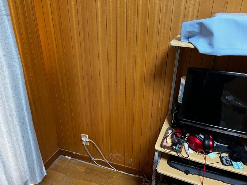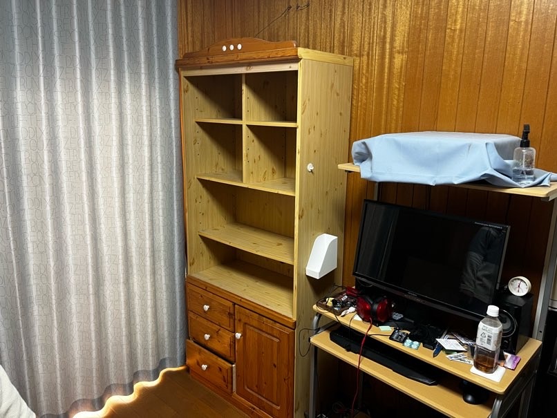 お客様のご自宅は一戸建てで、リビングの壁際に設置された木製収納棚を回収しました。棚は一体型で高さがあり、周囲にはデスクやテレビが並んでいたため、傷を付けないよう注意を払いながら作業を進めています。