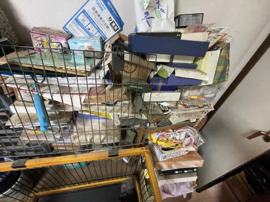 処分品はケージ奥にあり、動かさずに作業する必要がありました。奥側のスタッフが粗大ゴミを受け渡し、手前側で紙類中心の可燃ゴミを1点ずつ仕分けします。