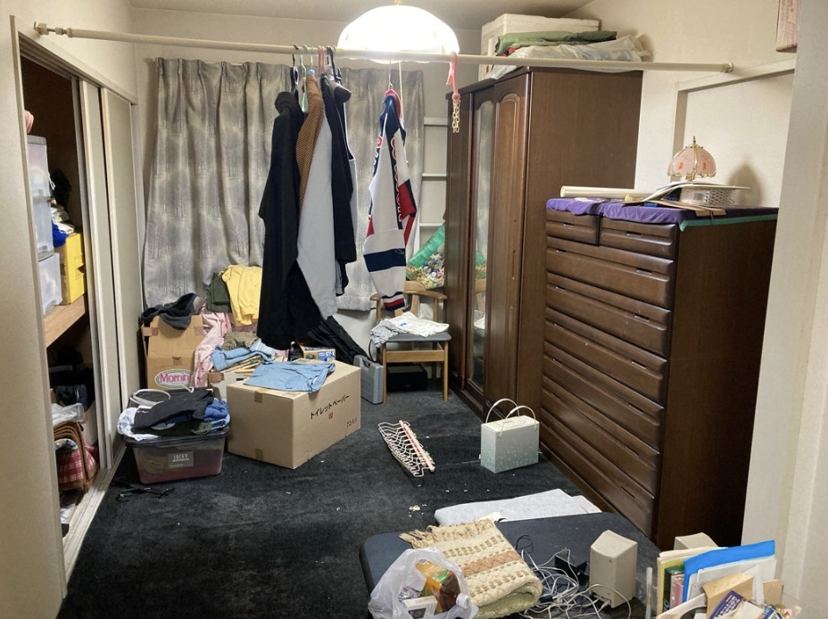 お部屋には大きなタンスがあり、動線確保が最優先でした。まず突っ張り棒や机を搬出し、収納ケースの衣類もまとめます。