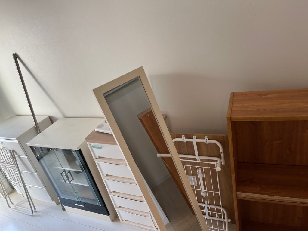 お客様は引っ越し前の慌ただしい中、残った家具の一括処分をご希望でした。ガラス面のある姿見は保護材で包み、洋服ダンスには養生を施して安全に搬出。小型家具も効率よく積み込み、40分ほどで作業が完了しました。